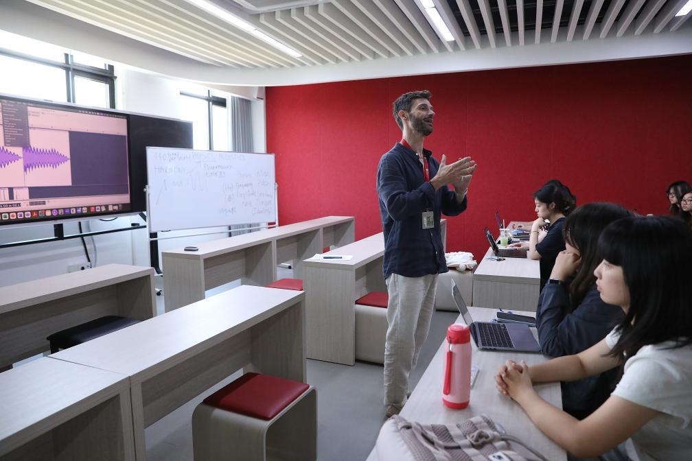 9月25日,海南陵水黎安國際教育創(chuàng)新試驗區(qū)中央民族大學海南國際學院的外籍教師在給學生上音樂技術與作曲課。新華社記者 鄭悅 攝
