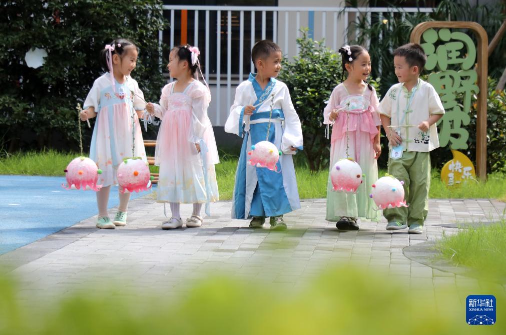 9月25日,在江蘇省蘇州市姑蘇區(qū)平潤實驗幼兒園,小朋友提著自制中秋花燈歡樂游園。