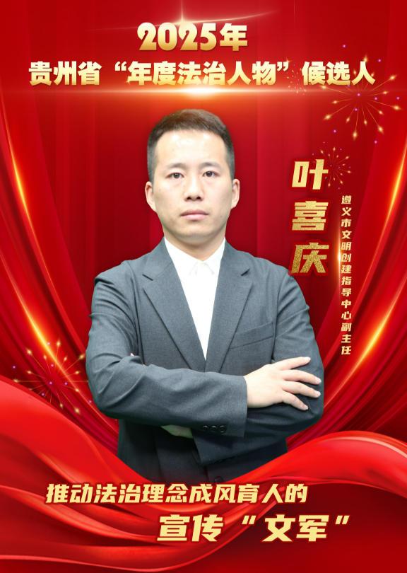 葉喜慶,現(xiàn)任貴州省遵義市文明創(chuàng)建指導(dǎo)中心副主任。2023年以來,他立足本職、守正創(chuàng)新,將法治理念、法治思維與法治方式融入精神文明建設(shè)各方面,以實(shí)際行動助推法治政府和文明遵義建設(shè)再上新臺階。