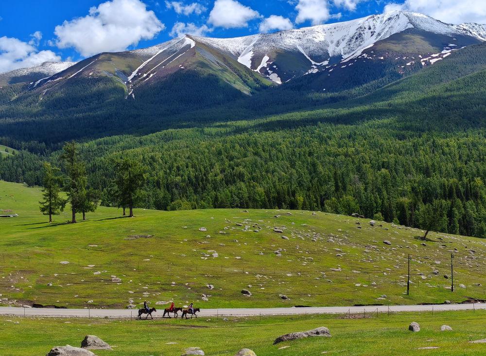 2024年6月4日,游客在新疆阿勒泰地區(qū)哈巴河縣騎馬游玩。電視劇《我的阿勒泰》播出后,新疆阿勒泰地區(qū)迎來(lái)客流高峰,“張鳳俠的小賣部”“巴太樹”“彩虹布拉克”等劇中地點(diǎn)成為熱門旅游打卡地。這場(chǎng)“邊城”與“熱劇”雙向奔赴的文旅盛宴,為當(dāng)?shù)亟?jīng)濟(jì)發(fā)展帶來(lái)新的增長(zhǎng)點(diǎn)。2024年5月,當(dāng)?shù)亟哟慰?15.03萬(wàn)人次,同比增長(zhǎng)60.81%;實(shí)現(xiàn)旅游收入36.53億元,同比增長(zhǎng)88.25%。