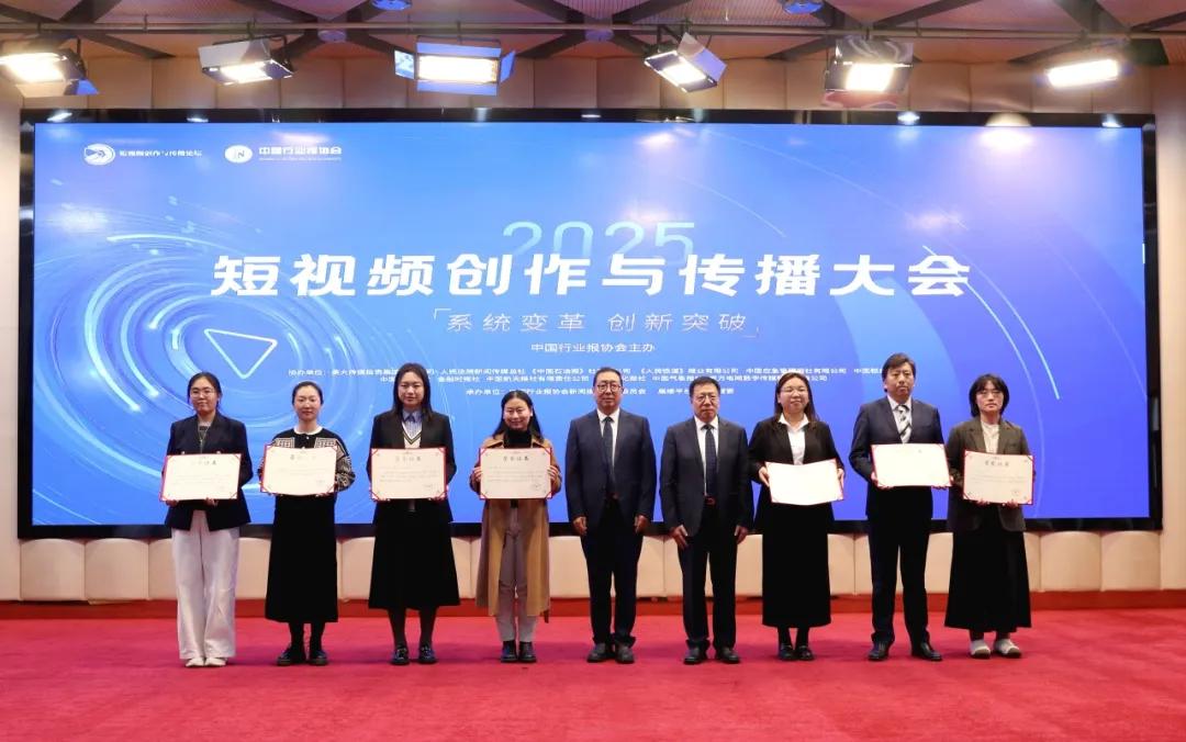 中國行業(yè)報協(xié)會會長張超文(右四),中國行業(yè)報協(xié)會駐會副會長孫福會(左五)向2025行業(yè)媒體短視頻大賽一等獎獲獎代表頒發(fā)證書。董芳忠/攝