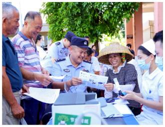 近日,海南省公安廳反走私和海岸管理總隊、總隊第一支隊聯合省老年病醫(yī)院在海口市演豐鎮(zhèn)演海村開展“健康惠民義診+反走私普法宣傳”警醫(yī)共建活動。圖為民警向村民發(fā)放反走私宣傳材料。(本報通訊員 代龍超 攝)