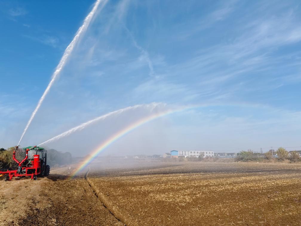 2025年12月9日,江蘇省江陰市對(duì)部分麥田進(jìn)行噴灌補(bǔ)水。(江陰市農(nóng)業(yè)農(nóng)村局供圖)