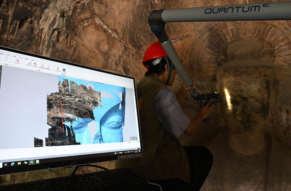 2025年4月9日,武漢大學(xué)文化遺產(chǎn)智能計算實驗室團隊成員在河南洛陽龍門石窟魏字洞使用關(guān)節(jié)臂掃描儀對佛像進行數(shù)字化掃描。龍門石窟研究院為石窟建立數(shù)字化檔案,借助激光掃描、高清攝影等技術(shù)手段收集文物數(shù)據(jù),以數(shù)字的形式留存千年石刻群的風(fēng)貌,致力于讓這一規(guī)模宏大、氣勢磅礴的石窟瑰寶“芳華永駐”。