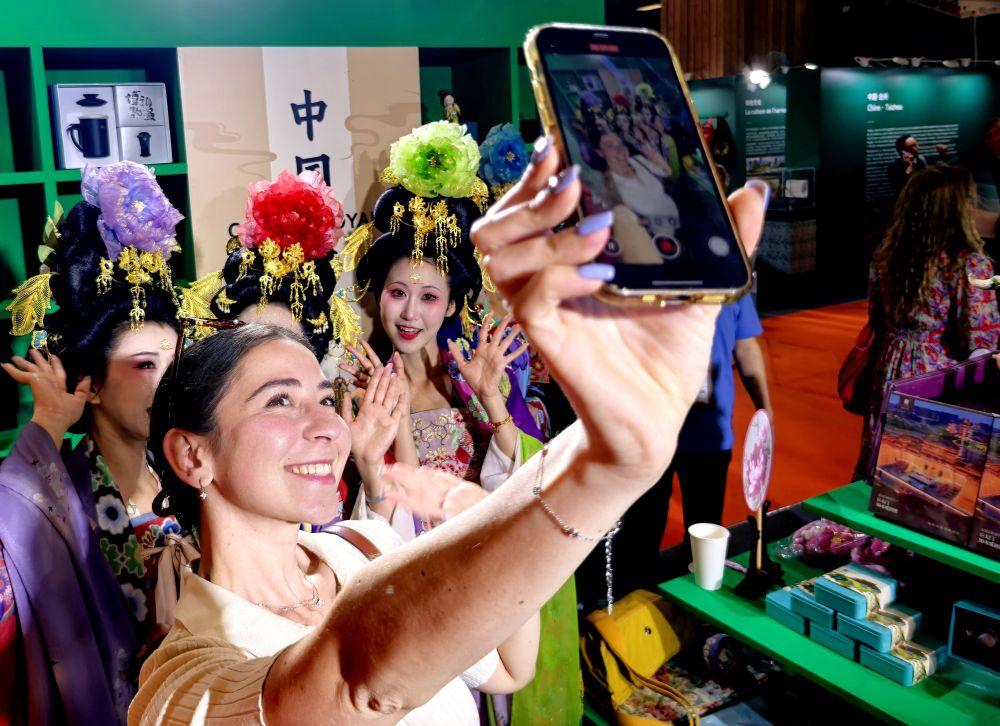 2025年4月30日,以“中國風(fēng)·中國潮”為主題的“遇鑒中國”2025中華文化主題展亮相當(dāng)天開幕的法國巴黎博覽會。這是參觀者與唐代仕女妝造的中方參展人員在巴黎博覽會上合影。