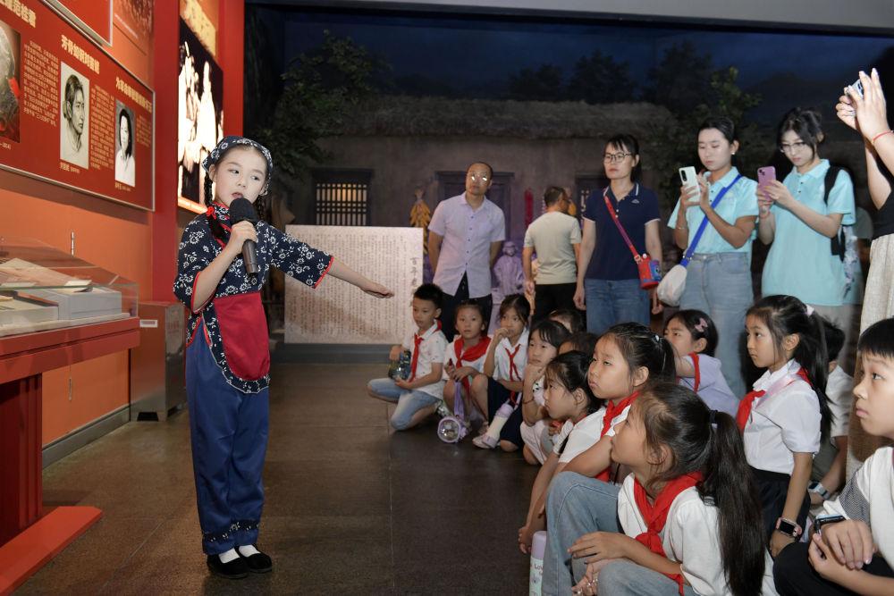 2025年8月7日,在山東沂蒙革命紀(jì)念館,臨沂市沂蒙紅孩子文藝先鋒隊的房沫昕在講述紅色故事《沂蒙紅嫂祖秀蓮》。沂蒙紅孩子文藝先鋒隊以“傳承沂蒙精神”為宗旨,通過歌舞、朗誦、故事講述、舞臺劇等紅色主題文藝節(jié)目,以深情表演弘揚主旋律,增強紅色文化感染力,為紅色基因代代相傳注入新生力量。