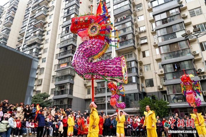 2月27日,湖北武漢,國(guó)家級(jí)非遺漢陽(yáng)高龍走進(jìn)社區(qū)進(jìn)行表演,以傳統(tǒng)民俗為居民送上馬年元宵祝福。圖為高龍隊(duì)隊(duì)員們?yōu)榫用襁M(jìn)行表演。中新社記者 張暢 攝