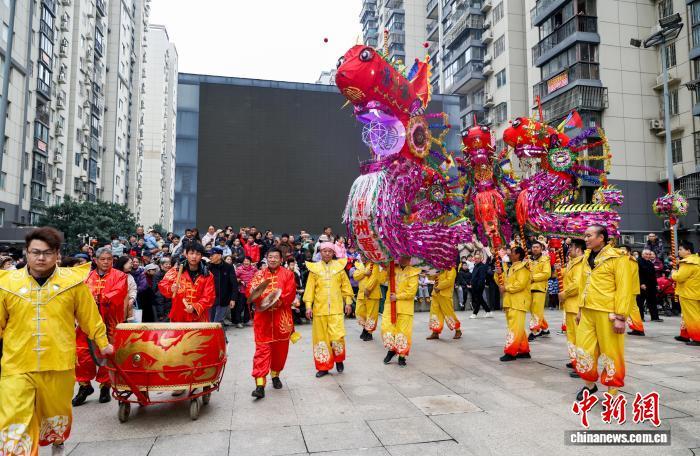 2月27日,湖北武漢,國家級非遺漢陽高龍走進(jìn)社區(qū)進(jìn)行表演,以傳統(tǒng)民俗為居民送上馬年元宵祝福。圖為高龍隊隊員們?yōu)榫用襁M(jìn)行表演。中新社記者 張暢 攝
