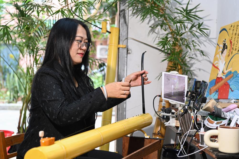 2月7日,蘇海珍在位于廣西東興市的工作室內(nèi)通過手機直播向網(wǎng)民演奏獨弦琴。