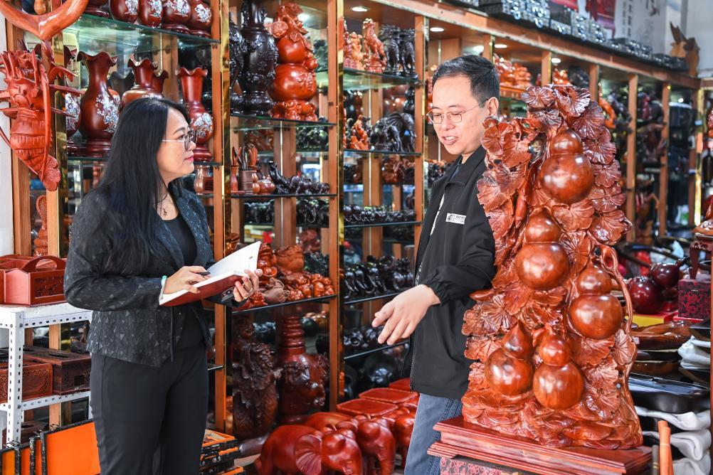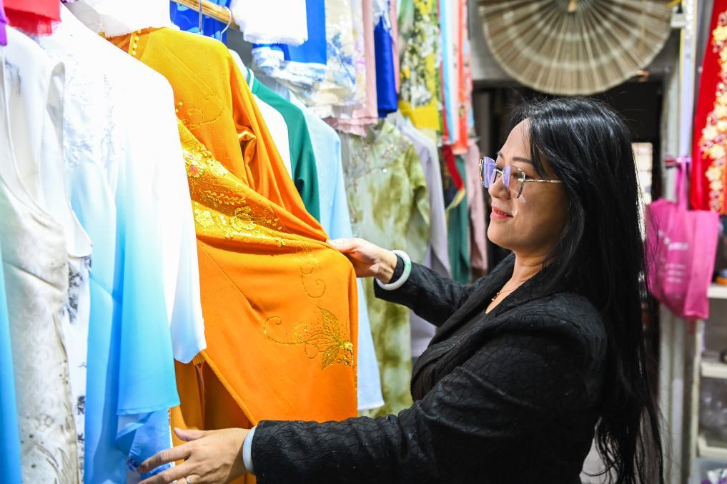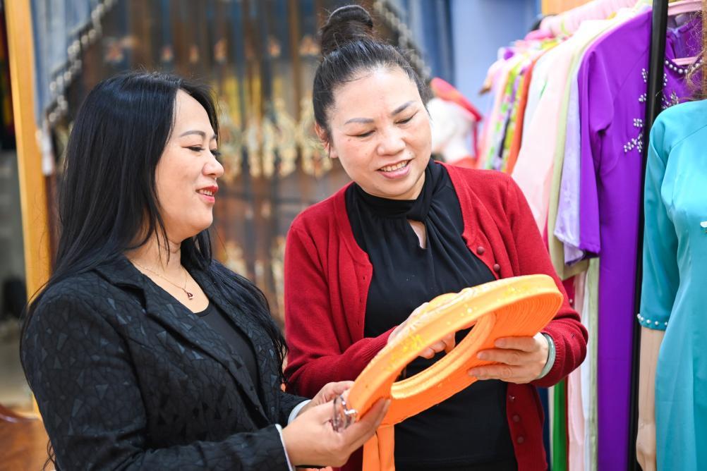 2月7日,在廣西東興市,蘇海珍在調(diào)研京族服飾的創(chuàng)新與銷售情況。