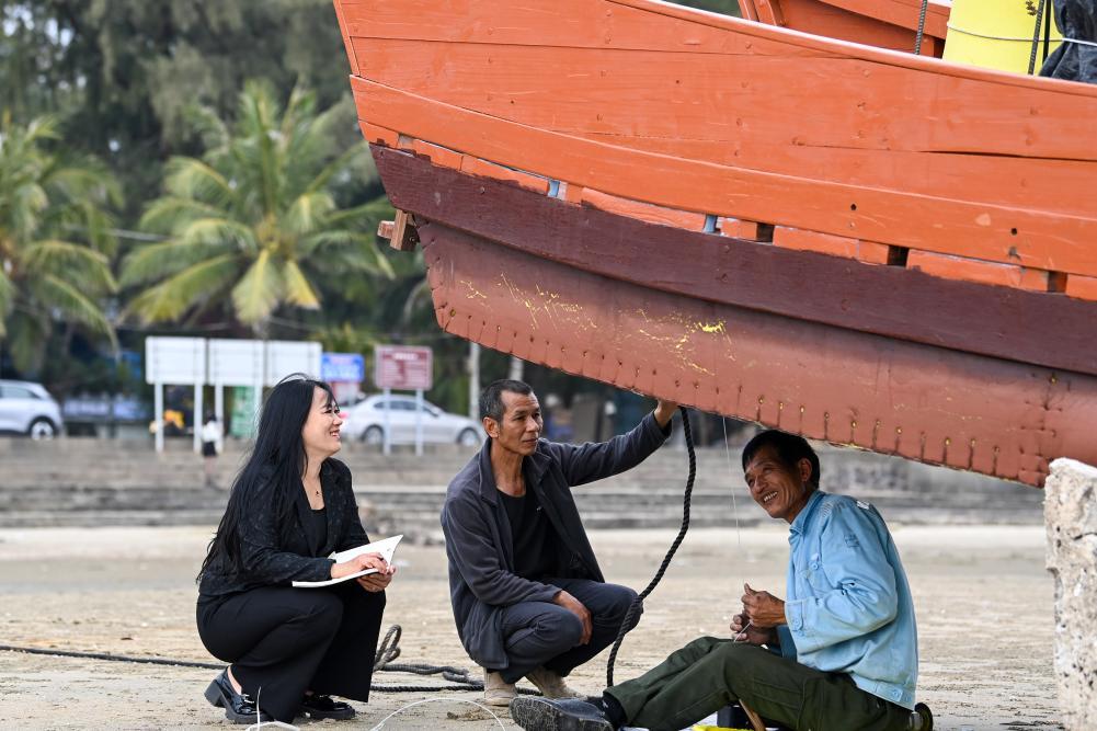 2月7日,在廣西東興市,蘇海珍(左)與當?shù)貪O民交流,了解他們的期盼。