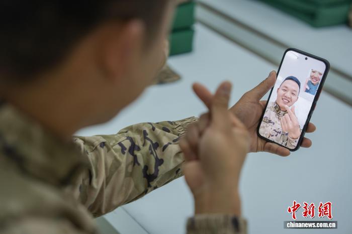 圖為武警官兵與家人通話。戴申澳 攝