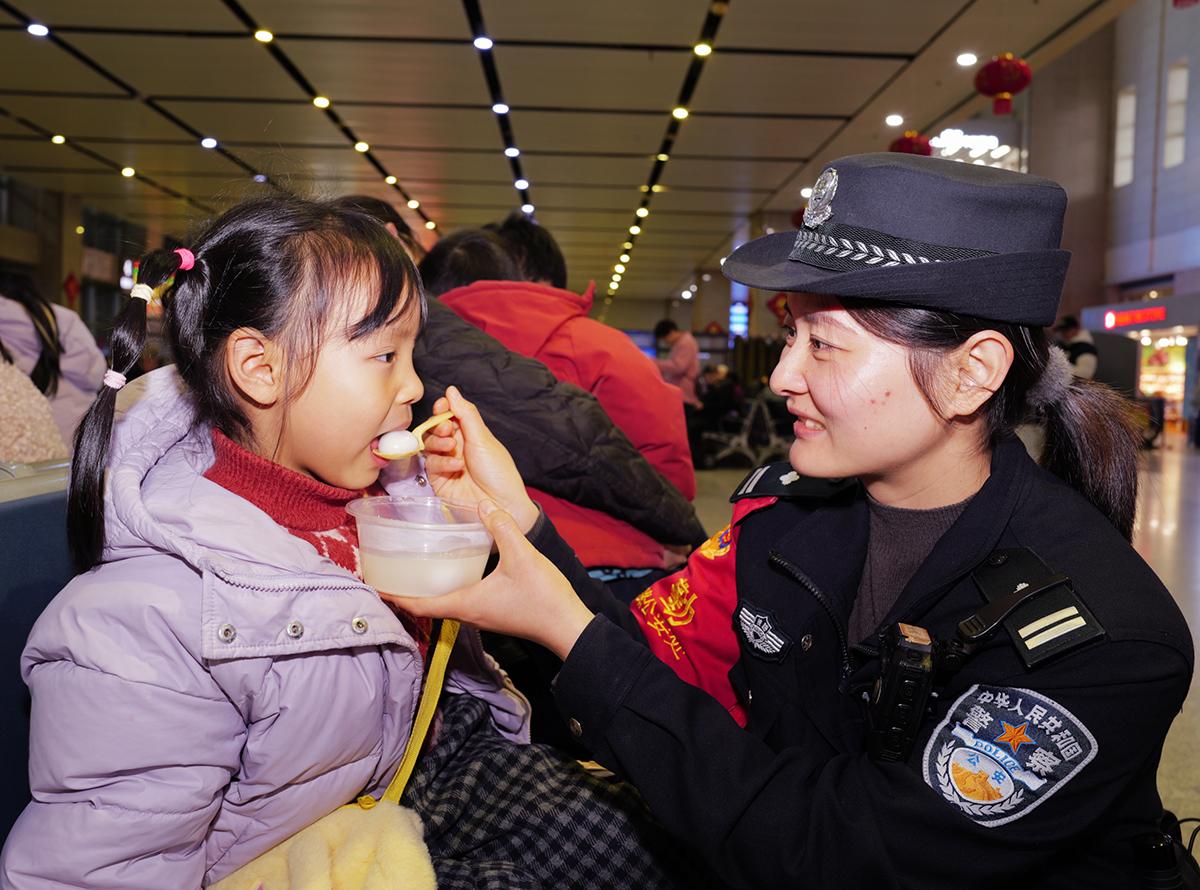 3月2日,湖北省宜昌東站迎來了春運(yùn)返程客流高峰。武漢鐵路公安局襄陽公安處宜昌東站派出所民警將湯圓送到候車室,與旅客共慶元宵佳節(jié),并開展法治宣傳。