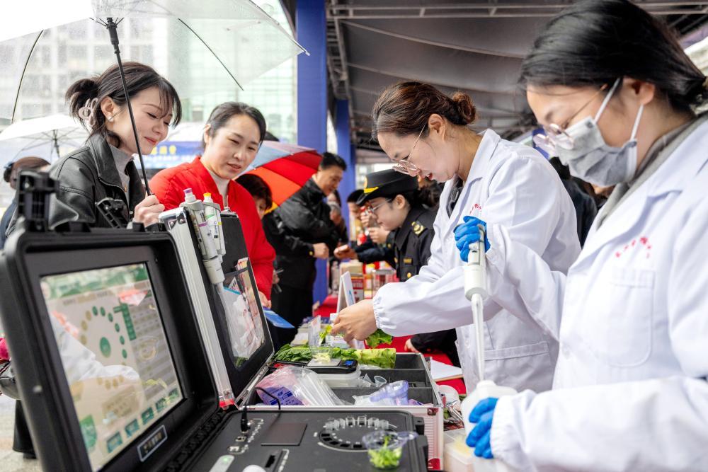 在浙江省湖州市長興縣放心消費嘉年華公益活動現(xiàn)場,該縣食品藥品檢驗檢測中心工作人員為市民提供免費果蔬檢測服務(wù)(2025年3月15日攝)。新華社發(fā)(譚云俸 攝)