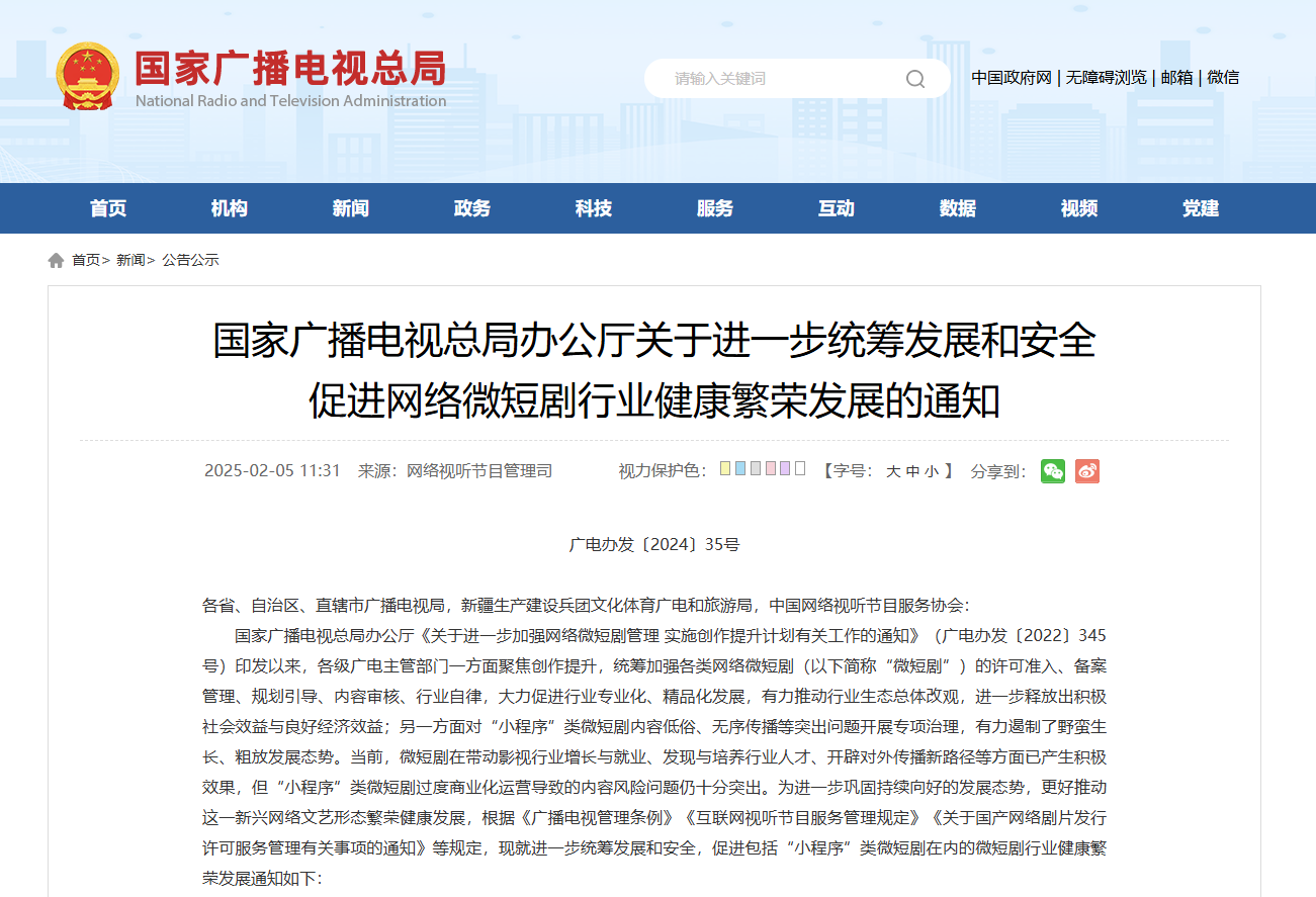 國家廣播電視總局辦公廳發(fā)布《關于進一步統(tǒng)籌發(fā)展和安全促進網絡微短劇行業(yè)健康繁榮發(fā)展的通知》