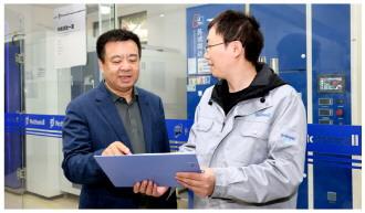 圖為全國(guó)人大代表周善紅(左)在江蘇某電氣公司調(diào)研。