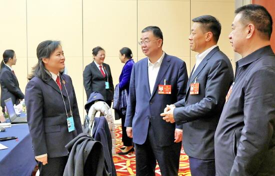 圖① 3月10日,十四屆全國人大四次會(huì)議山東省代表團(tuán)舉行小組會(huì)議,審議“兩高”工作報(bào)告。圖為代表在會(huì)后和“兩高”工作人員交流。