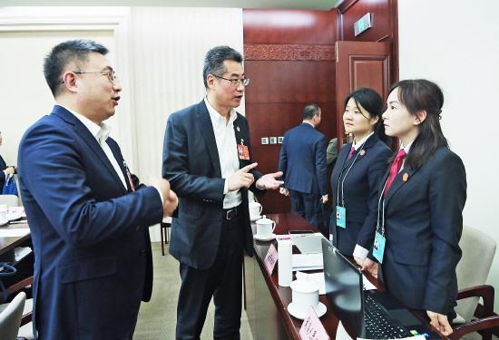 圖② 3月9日,全國政協(xié)十四屆四次會(huì)議舉行小組會(huì)議。天津市律師協(xié)會(huì)會(huì)長(zhǎng)牛同栩委員(左一)、上海市新的社會(huì)階層人士聯(lián)誼會(huì)會(huì)長(zhǎng)張毅委員(左二)會(huì)后和“兩高”工作人員就“兩高”工作報(bào)告溝通交流。