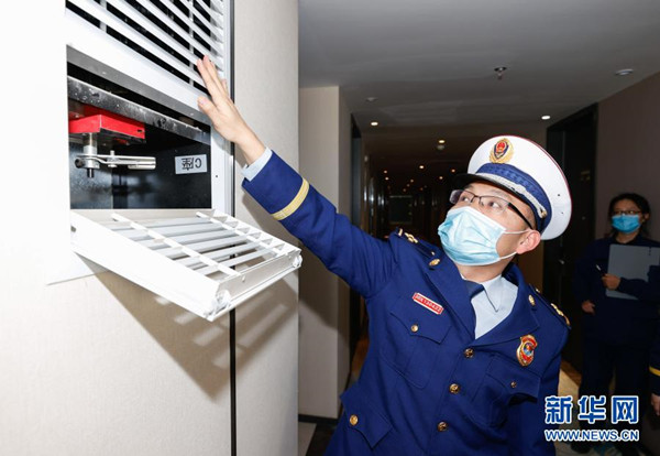 2月1日,消防監(jiān)督檢查人員在商務酒店內(nèi)現(xiàn)場測試排煙口風量?!?/span>