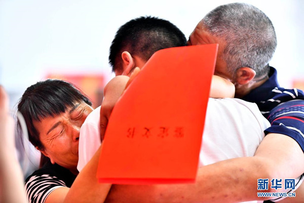 6月8日,在“認(rèn)親,我們在行動”濟南主會場,張某(左)和吳某林(右)擁抱著被拐的兒子。新華社記者 郭緒雷 攝
