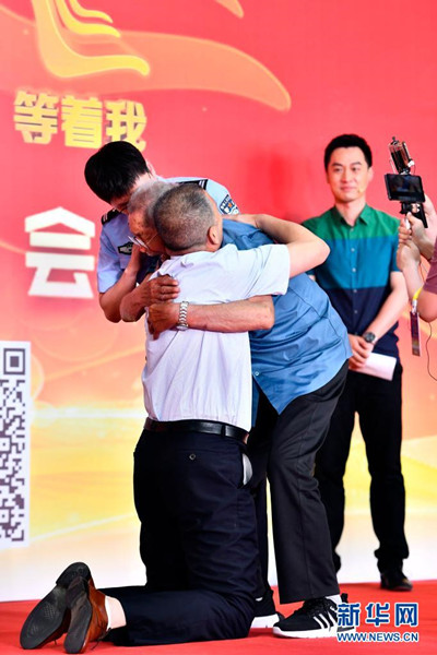 6月8日,在“認(rèn)親,我們在行動”濟南主會場,被拐58年的羅亞軍跪擁著90歲高齡的父親羅鳳坤。新華社記者 郭緒雷 攝