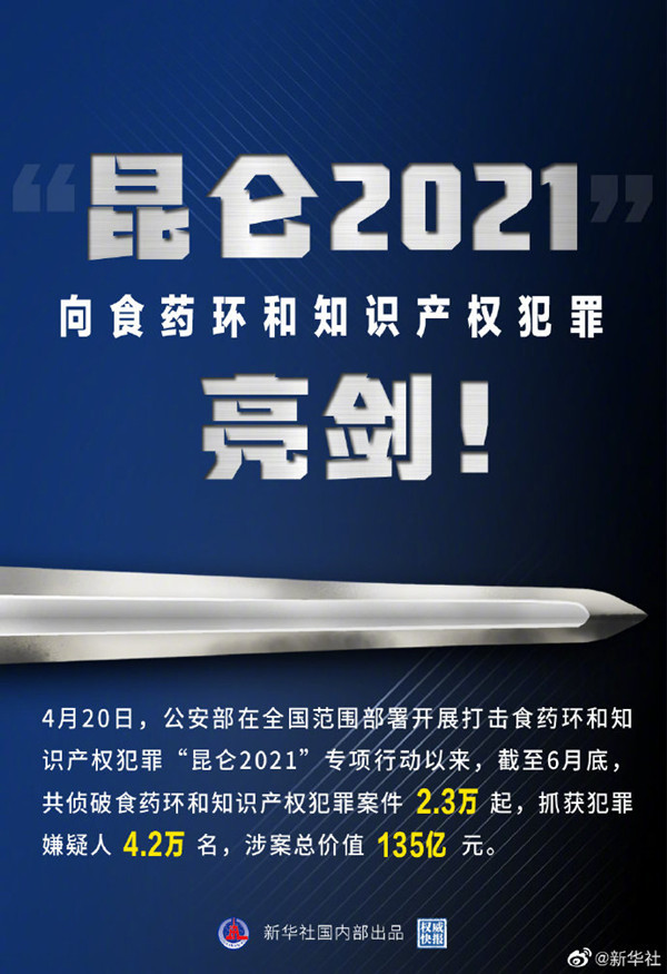 呵護“舌尖上的安全”、保障醫(yī)療用藥安全、打擊侵權(quán)假冒犯罪、打擊破壞生態(tài)環(huán)境犯罪……公安部29日召開新聞發(fā)布會介紹,公安部4月20日在全國范圍部署開展打擊食藥環(huán)和知識產(chǎn)權(quán)犯罪“昆侖2021”專項行動以來,截至6月底,共偵破食藥環(huán)和知識產(chǎn)權(quán)犯罪案件2.3萬起,抓獲犯罪嫌疑人4.2萬名,涉案總價值135億元。(記者熊豐,海報設計賈伊寧)