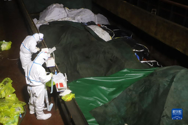 中國海警局直屬第二局執(zhí)法員對涉案凍品進(jìn)行取樣檢測(2月12日攝)。新華社發(fā)(張淼 攝)