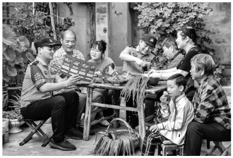 臨近端午節(jié),江蘇省鹽城市公安局鹽都分局民警來到轄區(qū)村莊,和村民裹真情葉、包平安米、扎警惕繩、許無詐愿,增強(qiáng)群眾反詐意識(shí)。圖為民警向村民講解反詐知識(shí)。