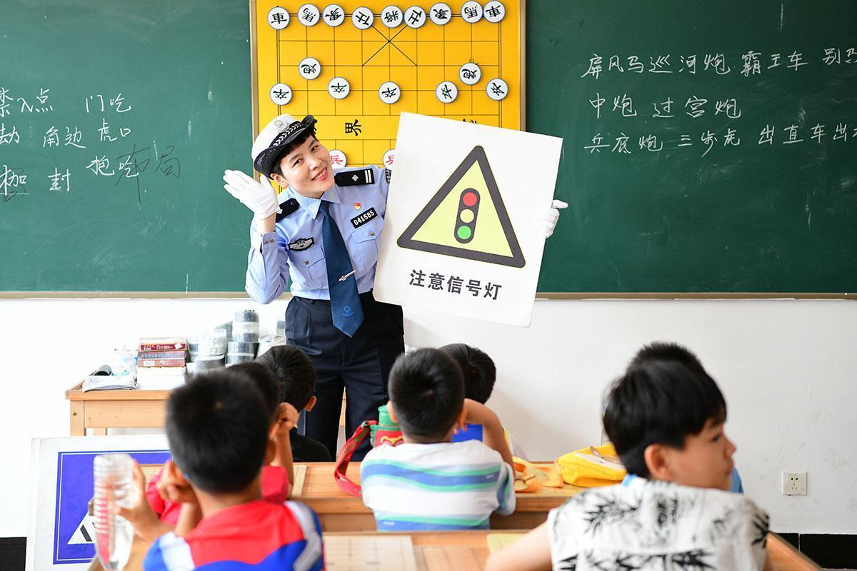 7月17日,安徽省阜南縣公安局交管大隊(duì)民警在少年活動(dòng)中心為暑期興趣班學(xué)生講解出行安全知識(shí),增強(qiáng)學(xué)生出行安全意識(shí)。圖為民警向?qū)W生介紹交通標(biāo)識(shí)。