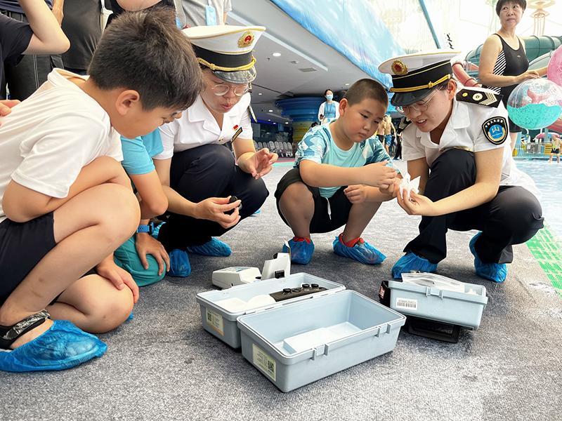 北京市衛(wèi)生健康監(jiān)督所衛(wèi)生監(jiān)督員邀請小朋友體驗快速檢測泳池水余氯情況