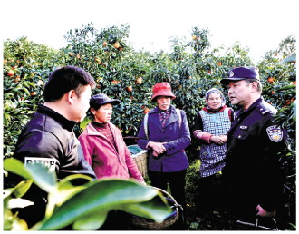圖為韓濤(右一)生前在柑橘銷售時節(jié)向農(nóng)戶開展安全宣傳。 秭歸縣公安局供圖