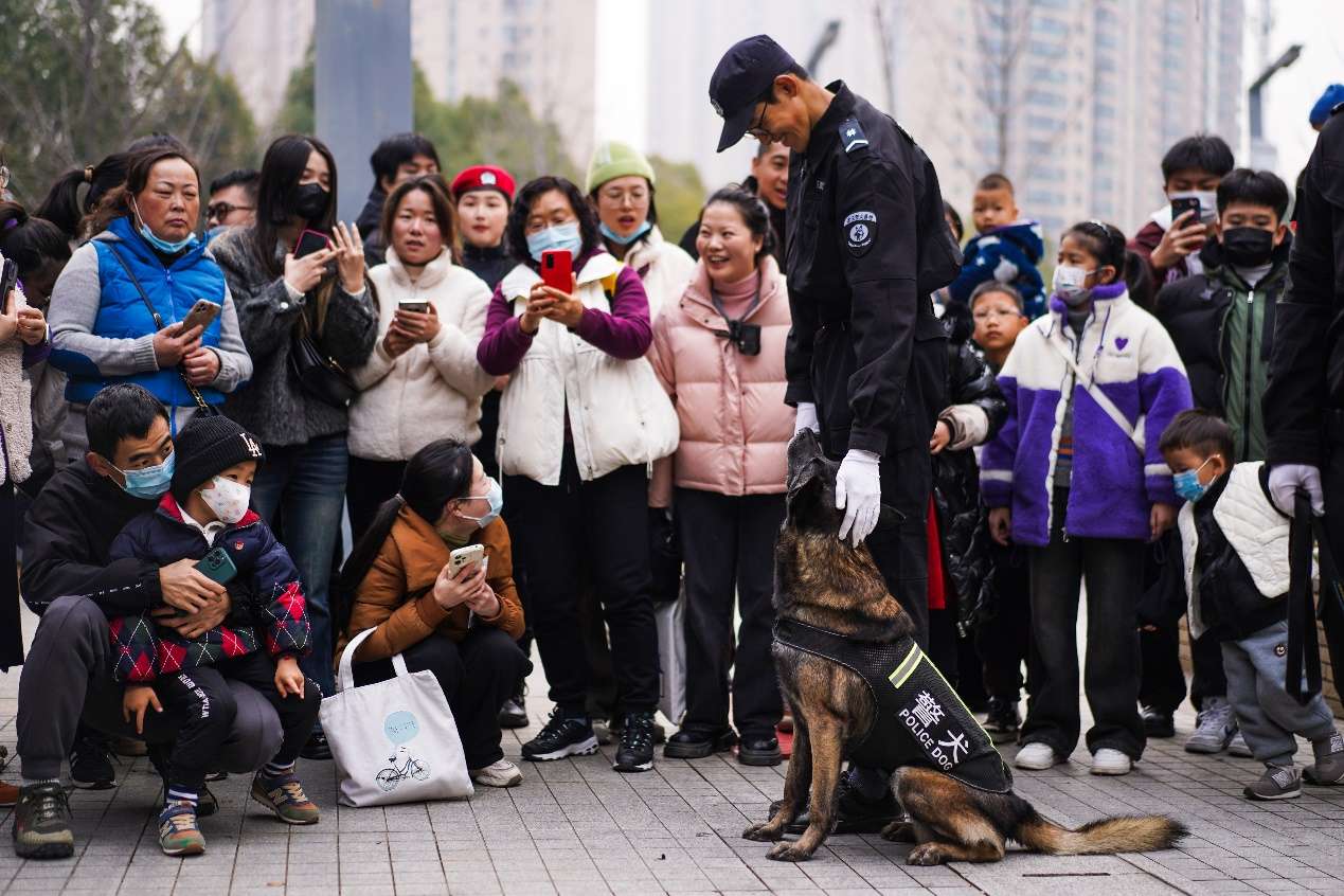 1月7日,湖北省武漢市公安局舉行主題為“平安武漢 共同締造”的警營開放日活動(dòng),黨風(fēng)政風(fēng)警風(fēng)監(jiān)督員、醫(yī)護(hù)工作者、網(wǎng)約車司機(jī)、金融從業(yè)人員等社會(huì)各界萬余名群眾來到現(xiàn)場(chǎng),零距離觀摩、體驗(yàn)公安工作和警營文化。圖為群眾與剛剛完成搜毒演練科目的警犬及其訓(xùn)導(dǎo)員互動(dòng)。