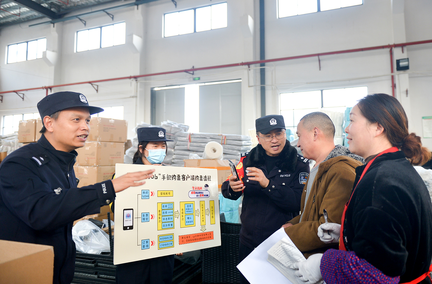 1月15日,杭州鐵路公安處臺州站派出所民警在企業(yè)車間,指引務工人員在鐵路12306官方平臺購買春運期間車票。
