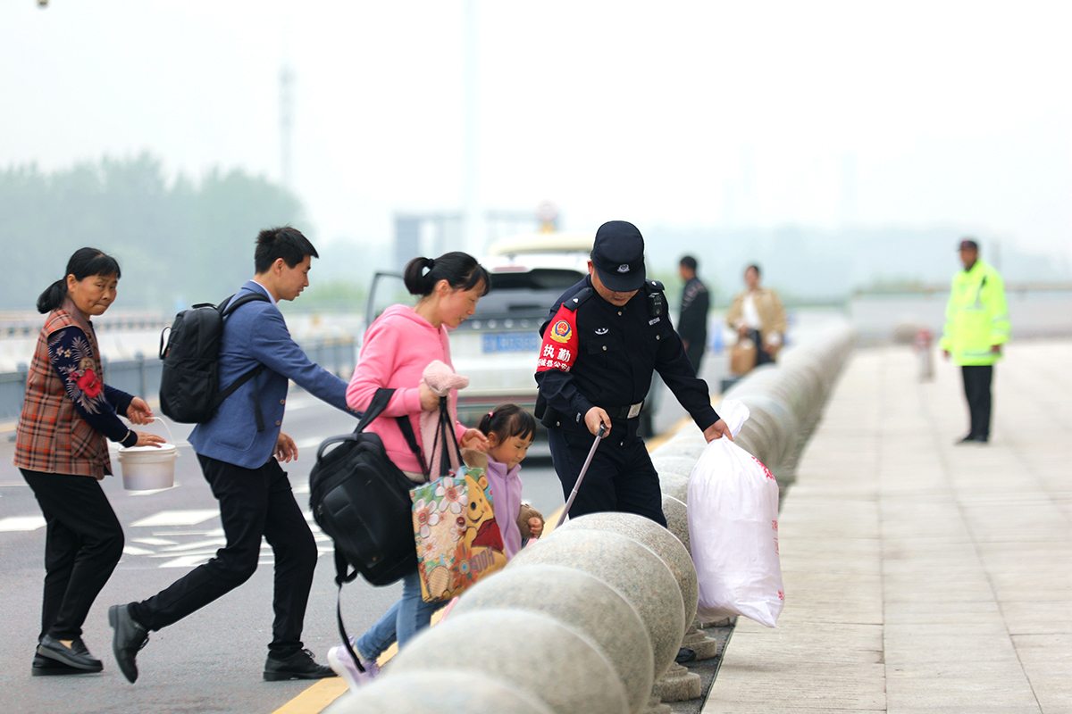 5月5日,安徽省舒城縣公安局千人橋派出所聯(lián)合高鐵東站警務(wù)站民警輔警在入站口平臺(tái)疏導(dǎo)交通、服務(wù)群眾,確保返程旅客平安出行。圖為執(zhí)勤輔警幫助旅客快速通過(guò)車(chē)輛通道。