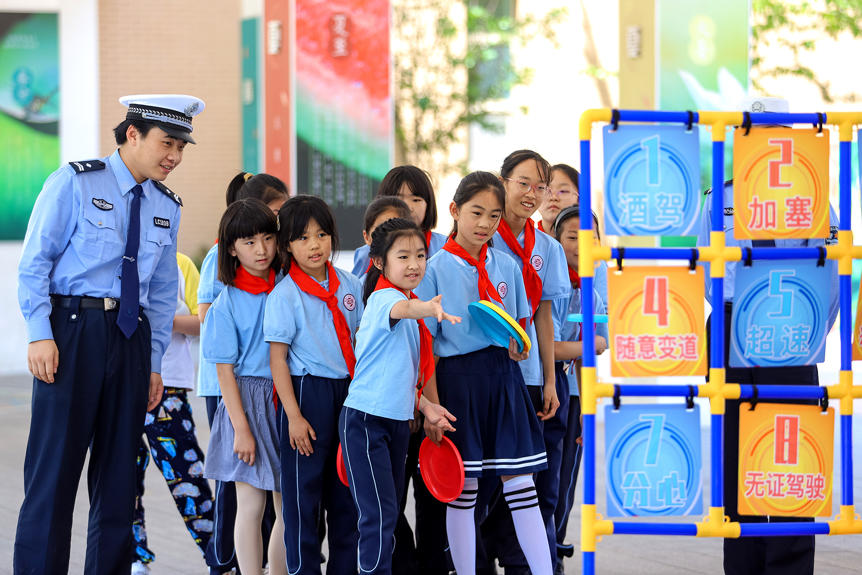 5月29日,山東省青島市公安局交通警察支隊李滄大隊民輔警來到廣水路小學(xué),舉辦“筑牢安全防線 共建平安校園”主題活動。圖為學(xué)生通過飛盤游戲形式學(xué)習交通安全知識。