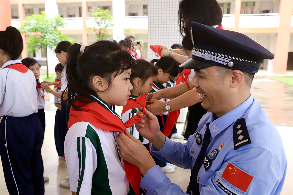 近日,珠海邊檢總站開平邊檢站組織民警來到開平市梁金山小學(xué)開展進(jìn)校園活動(dòng),為學(xué)生們帶來一堂生動(dòng)的愛國主義教育課。圖為開平邊檢站移民管理警察為新加入少先隊(duì)的學(xué)生佩戴紅領(lǐng)巾。
