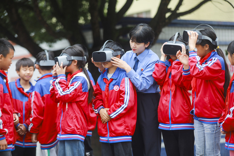 6月17日,貴州省黔西市人民檢察院組織檢察官走進(jìn)轄區(qū)雨朵鎮(zhèn)扯泥小學(xué),開展禁毒主題宣傳活動(dòng),通過展示毒品模型、發(fā)放宣傳頁、VR眼鏡認(rèn)識(shí)毒品危害等,向?qū)W生講解新型毒品種類、特征和危害,提高學(xué)生識(shí)毒、拒毒、防毒意識(shí)。圖為檢察官指導(dǎo)小學(xué)生利用VR眼鏡認(rèn)識(shí)毒品的危害。