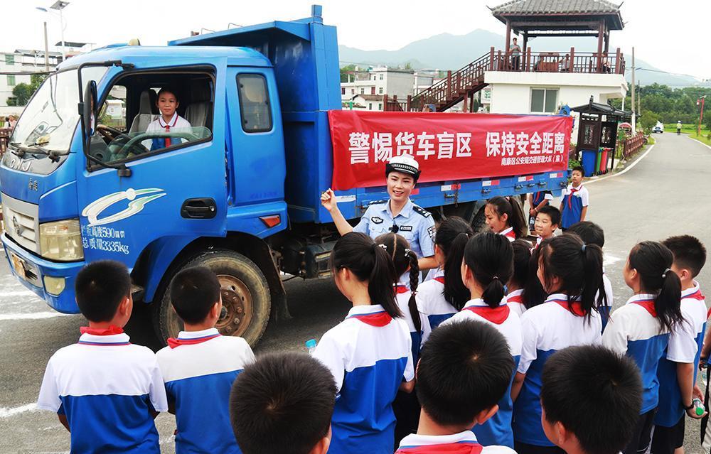 進(jìn)入暑期以來,江西省贛州市南康區(qū)公安局交管大隊組織民警通過寓教于樂的形式開展交通安全教育活動,提高學(xué)生“知危險、會避險”的交通安全防護(hù)意識。圖為7月30日,民警組織孩子們體驗(yàn)實(shí)景模擬貨車通行安全盲區(qū),宣講出行注意事項(xiàng)。