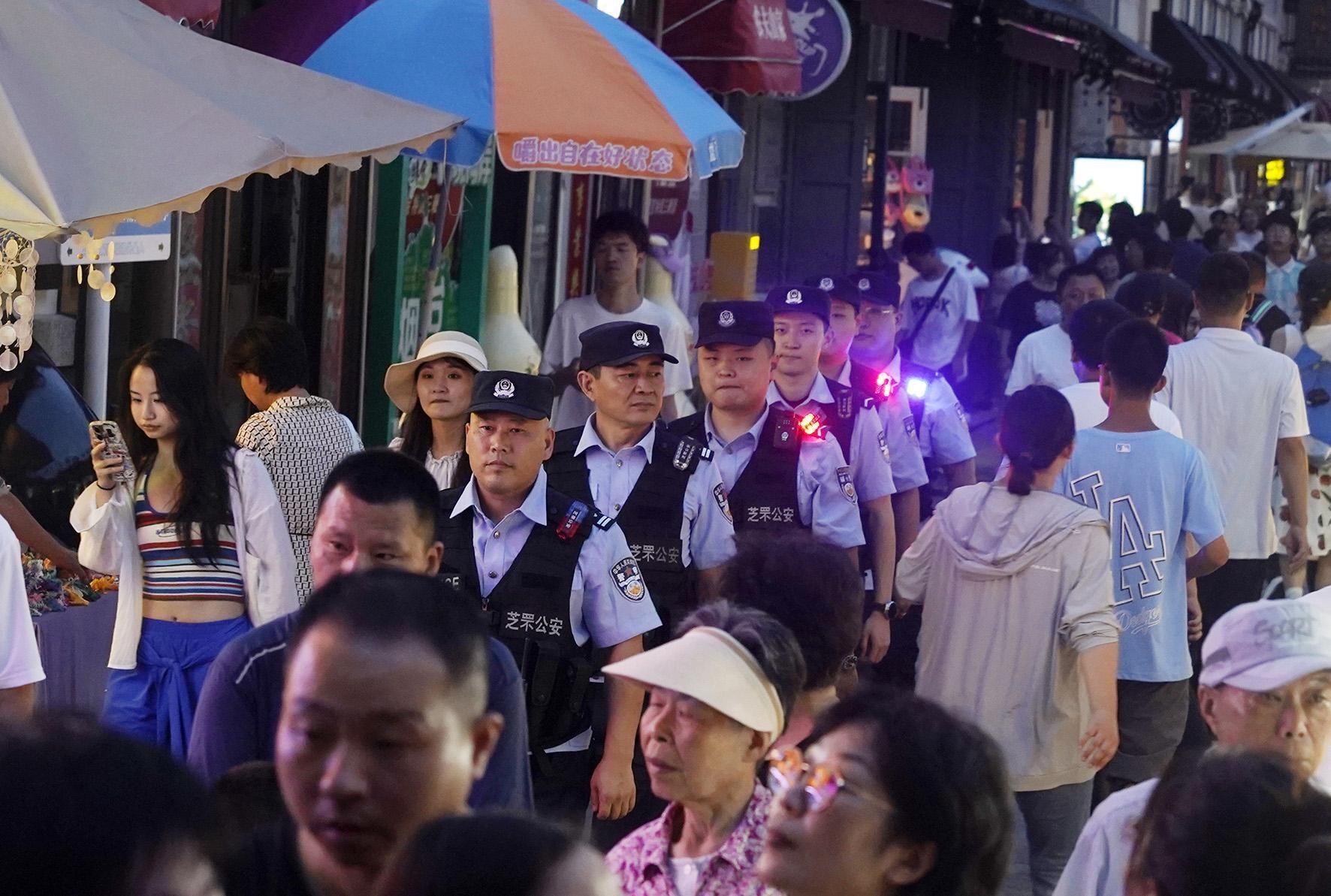 近日,山東省煙臺(tái)市公安局開(kāi)展夏夜治安巡查宣防第二次集中統(tǒng)一行動(dòng),組織警力加大對(duì)景區(qū)、車(chē)站等人員密集區(qū)域的檢查和巡防力度,全力營(yíng)造安全穩(wěn)定的社會(huì)治安環(huán)境。圖為煙臺(tái)市公安局芝罘分局民警在朝陽(yáng)街景區(qū)巡邏。