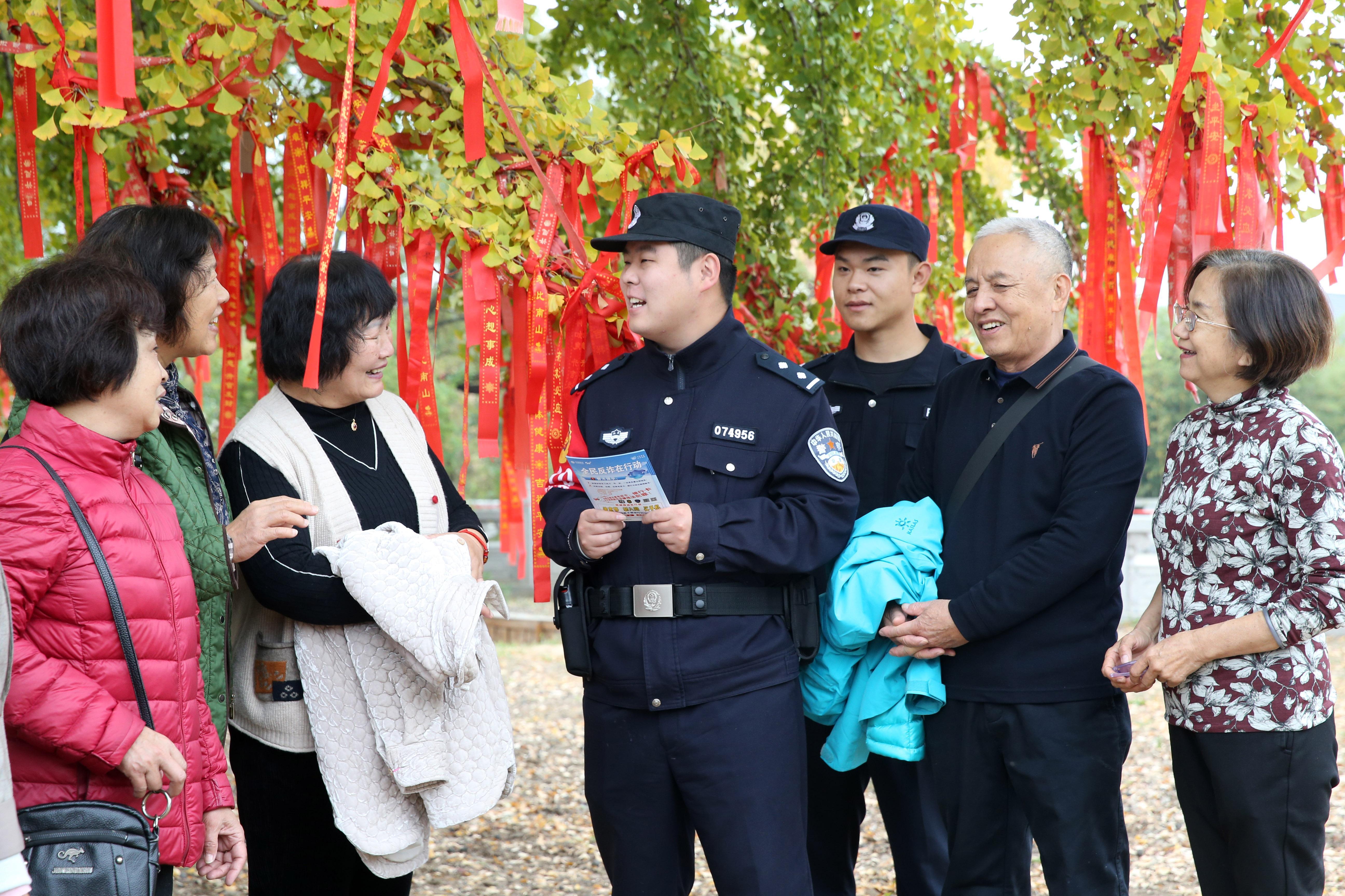 近日,山東省臨沂市郯城縣新村銀杏開發(fā)區(qū)內(nèi)的三千年古銀杏樹進(jìn)入最佳觀賞期,吸引眾多游客前來打卡。郯城縣公安局新村派出所民警來到景區(qū)開展反詐宣傳活動,提高游客的防詐意識。圖為十一月十日,民警向游客普及反詐知識。