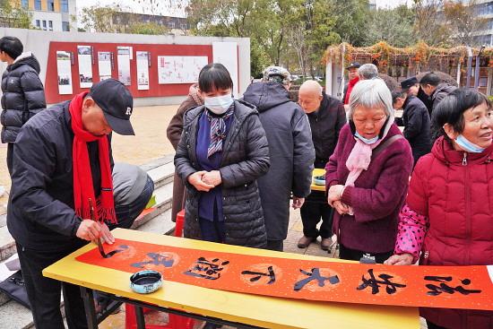 原來,當天是三二五村的“新春送對聯(lián)”活動日。8時30分,村頭紅色文化廣場上已聚了不少人,書法家揮毫題聯(lián),觀眾喝彩聲不斷。匆匆趕來的黎伯忙前忙后,幫村里人布好紅紙,又用帶來的青磚壓住未干的春聯(lián)防止被風吹跑。