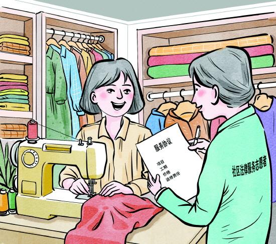 北京市豐臺(tái)區(qū)的陳女士曾在服裝廠做流水線車(chē)工,每天不僅工作辛苦,還有嚴(yán)格的上下班考勤,后來(lái)工廠搬遷到外地,她不愿背井離鄉(xiāng),便在家附近的小區(qū)一樓租了一間空房,于去年三月開(kāi)了一家依靠老顧客介紹的手工改衣店。開(kāi)店后,社區(qū)法律服務(wù)志愿者為她定制相關(guān)服務(wù)協(xié)議,寫(xiě)明項(xiàng)目、工期、價(jià)格、返修責(zé)任,避免了可能發(fā)生的糾紛。在社區(qū)做了登記備案后,居民更信任,改衣店的客源也比之前多了一倍。