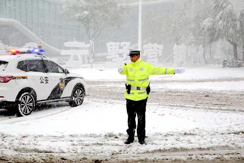 11月7日一早,德州市山東德城區(qū)積雪已超15毫米,路面濕滑,給廣大市民出行帶來很大的安全隱患。德州交警啟動(dòng)應(yīng)急預(yù)案,在轄區(qū)重點(diǎn)路段、路口增派警力,疏堵保暢,同時(shí)加大巡邏管控力度,幫助“趴窩”車輛解困,快速處理路面刮擦事故,全力確保道路交通安全,被群眾稱為雪中的熒光“路標(biāo)”。