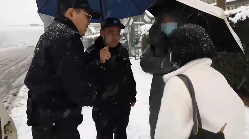 圖為濟(jì)南市公安局市中區(qū)分局大觀園派出所民警幫助賈女士找回雪中乘錯(cuò)車的孩子。