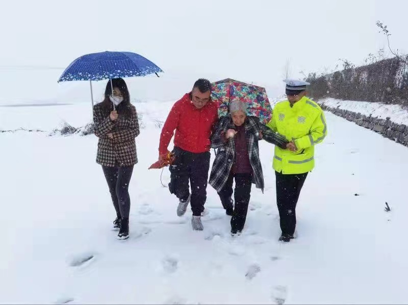 圖為濟(jì)南市公安局交警支隊(duì)長清大隊(duì)歸德中隊(duì)民警將遇困車輛上的老人攙扶到中隊(duì)。