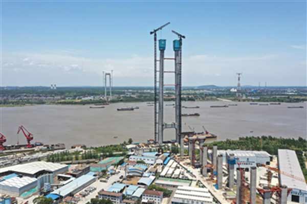 正在建設(shè)中的龍?zhí)堕L江大橋位于南京長江四橋與潤揚長江大橋之間,北接揚州儀征市,南接南京市、鎮(zhèn)江句容市,雙向六車道,設(shè)計時速100公里,全長4925米。新華社記者 楊磊 攝