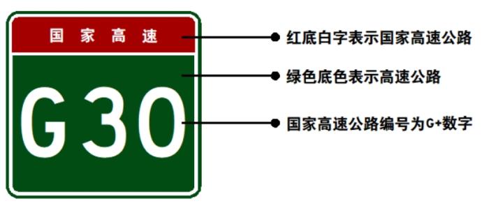 例如下圖所示是我國的最長的一條高速公路G30連霍高速(連云港至霍爾果斯高速公路)的標識。其上方是紅底白字,標識“國家高速”,連霍高速是一條東西橫線,下方編號為國道標識符G和兩位偶數(shù)30。