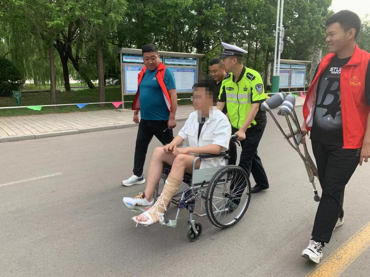 6月7日上午7時(shí)10分許,山東省諸城市公安局交警大隊(duì)民警在諸城一中高考考點(diǎn)執(zhí)勤時(shí),接到一名考生家長求助稱,其兒子在高考前左腳跖骨不慎骨折,打上了厚厚的石膏,導(dǎo)致行動(dòng)不便。由于考點(diǎn)周邊道路實(shí)行交通管制以保障高考順利進(jìn)行,社會(huì)車輛無法通行,所以家長向執(zhí)勤交警求助。