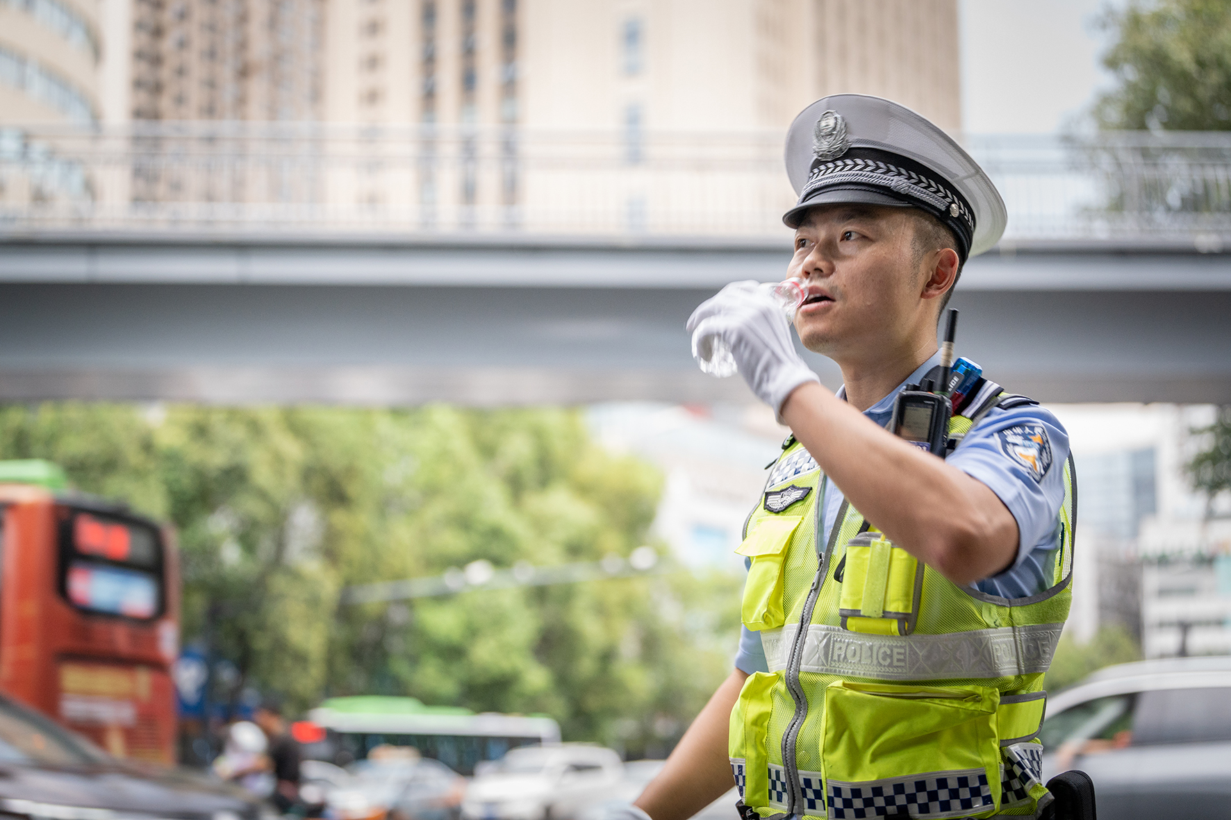8月8日,四川省綿陽市出現(xiàn)34℃高溫天氣。綿陽市公安局交警直屬一大隊民警堅守路面,冒高溫指揮疏導(dǎo)交通,確保道路安全暢通。
