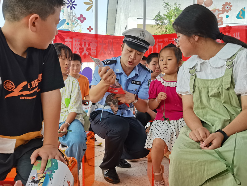 8月15日,安徽省南陵縣公安局交管大隊(duì)民輔警在轄區(qū)兒童中開展交通安全宣傳活動,增強(qiáng)他們知危險(xiǎn)、會避險(xiǎn)意識。